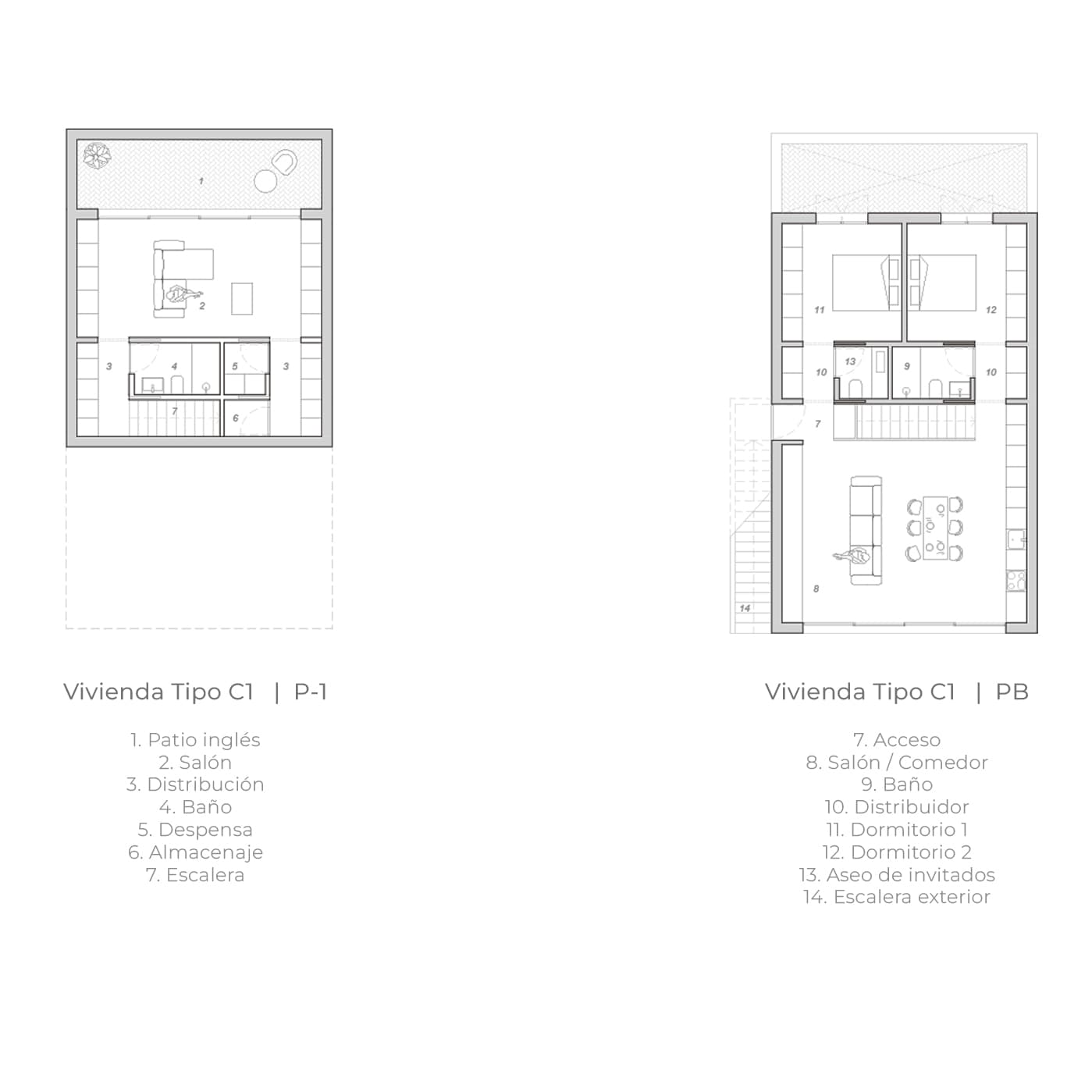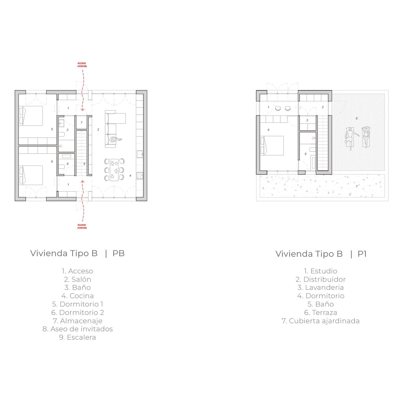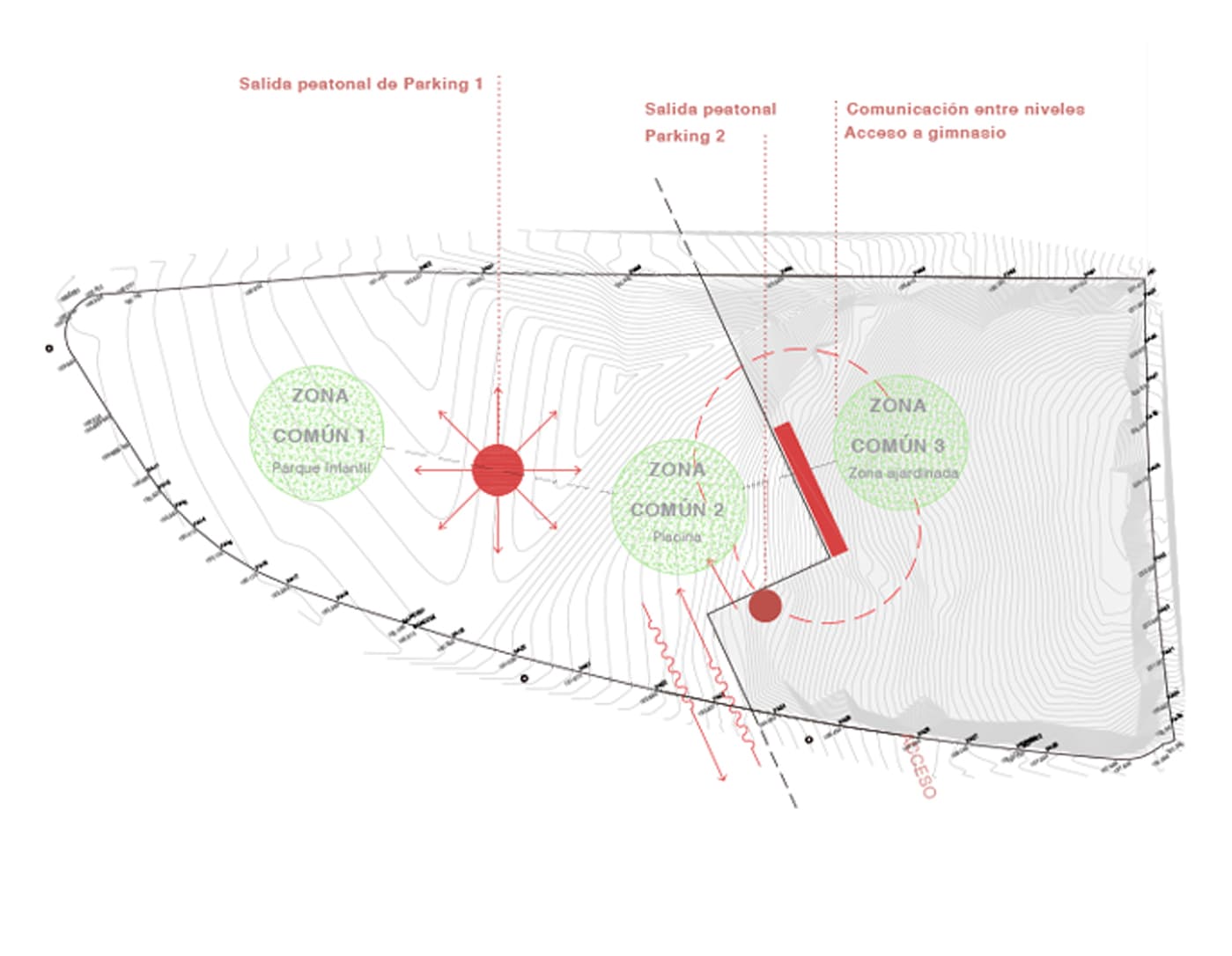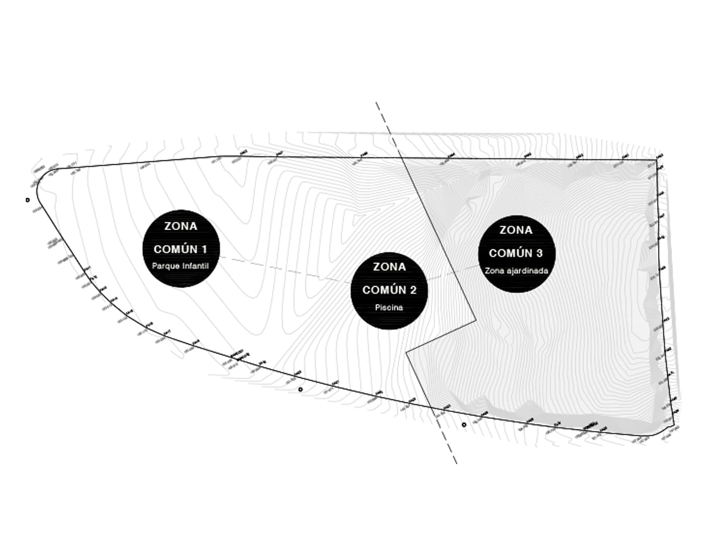 El límite entre las vivienda y el espacio común se encuentra desdibujado con el objetivo de generar un espacio entendido desde la totalidad del conjunto, evitando una separación másica entre las piezas y empleando sistemas más transparentes como la vegetación. Se plantean espacios de juego, deporte y piscina encadenados entre sí y siempre rodeados por especies vegetales autóctonas, respetando las ya existentes e incorporando nuevas.