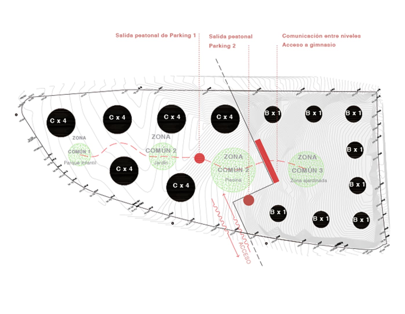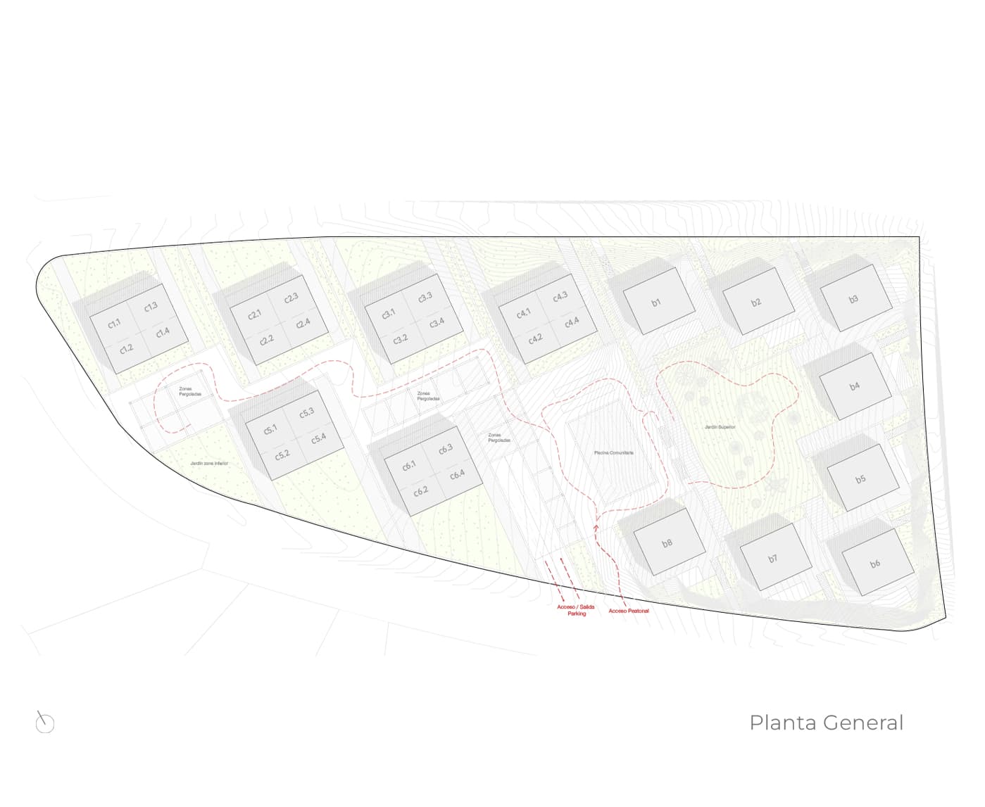 Situado en un entorno privilegiado, en contacto directo con la naturaleza, se pretende abordar el proyecto de la manera más respetuosa posible con el territorio. Empezando por la disposición de las viviendas, se establecen dos zonas de diferente altura siguiendo las trazas de la topografía, orientando los volúmenes para una mejor captación de luz solar y una ventilación adecuada, que posibilite la regulación de temperatura.