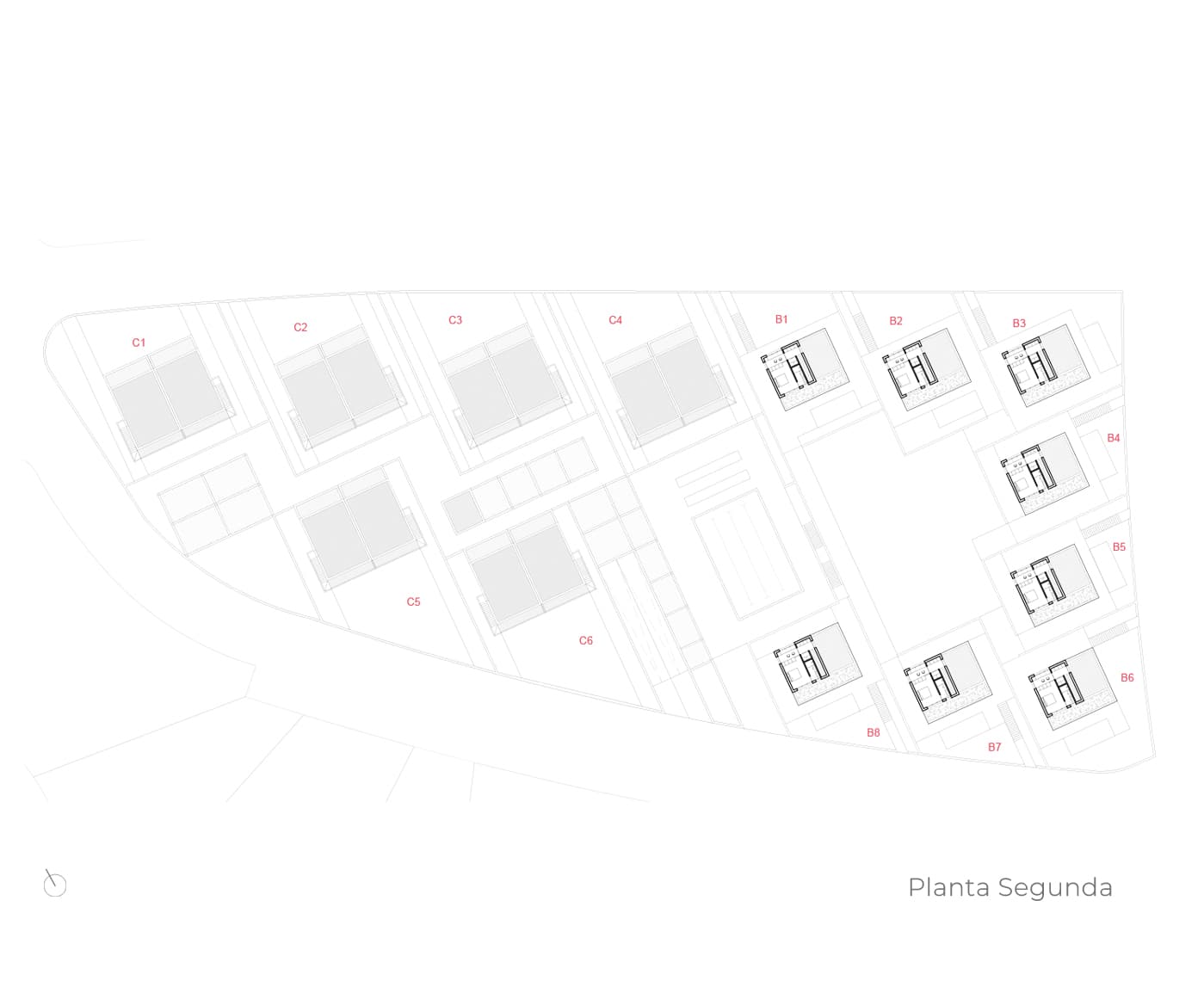 Die Grenzen zwischen den Wohnungen und dem Gemeinschaftsbereich verschwimmen, um einen Raum zu schaffen, der vom gesamten Komplex geteilt wird. Wir setzen auf transparente Systeme, die auf massive Trennwände verzichten und stattdessen Elemente wie Vegetation einsetzen. Die Bereiche für Spiele, Sport und das Schwimmbad sind sorgfältig geplant und miteinander verbunden. Sie sind von einheimischen Pflanzen umgeben und respektieren sowohl die bereits vorhandene Vegetation als auch die Integration neuer Elemente.