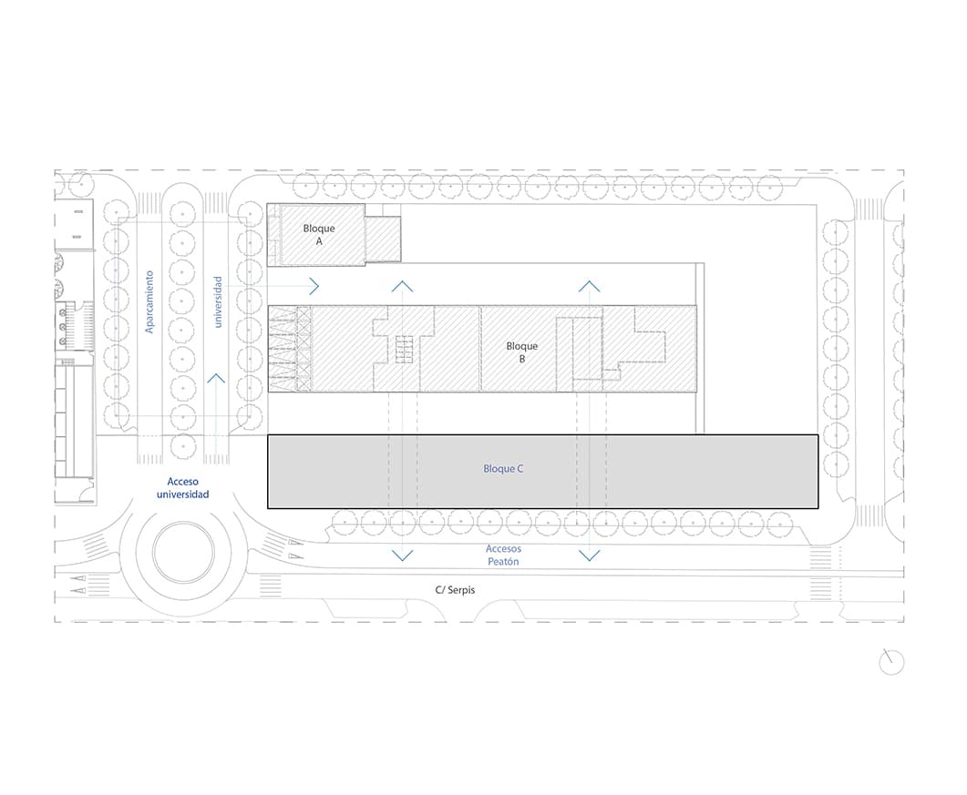 The site of the proposed building is located in the neighborhood of "La Carrasca" in the city of Valencia. Specifically, it comprises a plot of 7,738 m² with two existing structures (Block A and Block B), belonging to the University of Valencia. The new project occupies 2,349.69 m² of that space. The main priority of the project refers to the connection of the new building (Block C) with Block B and the intermediate street between them.
