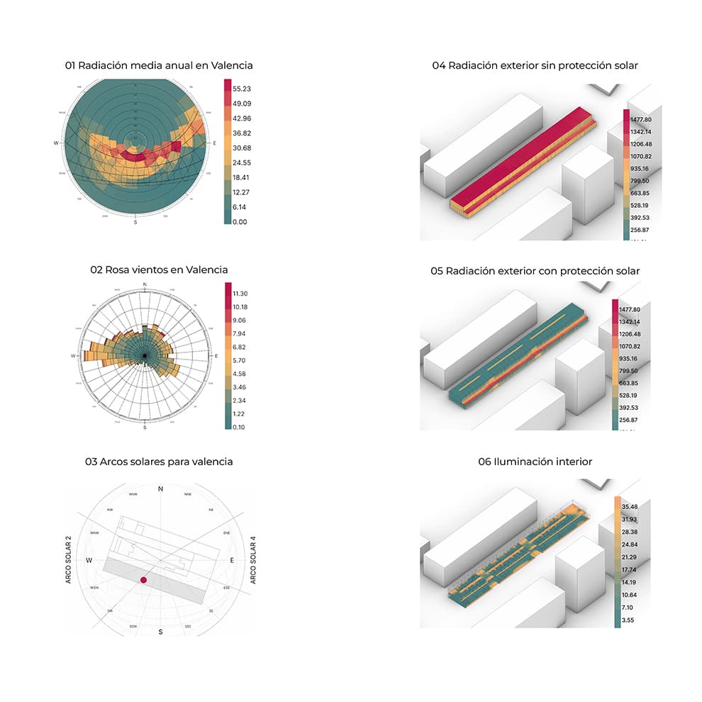 We used the information of the public competition as well as floor plans with a preliminary distribution and a table of surfaces made by the Technical Unit of the University of Valencia, to carry out an exhaustive analysis of the program, the needs and the bioclimatic function of the building. The conclusive research informed the further development of our proposal.