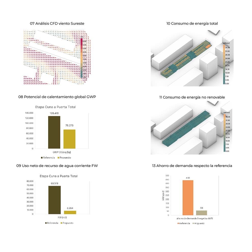 Se ha escogido una estructura de hormigón, de larga vida útil y bajo coste, con mucha inercia térmica, que colabora directamente en el confort pasivo del edificio. En la parte superior se activa la masa térmica del forjado con sistemas radiantes. La modulación heredada del Bloque B, ordena los espacios, unificando los accesos con el del edificio contiguo.
